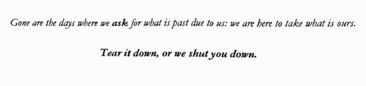 The Snowflakes closed their 12 page list of over 40 demands not with their names and signatures or a typical enclosure, but with a threat:
