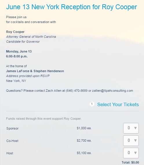 Roy Cooper’s name appears a second time in the leaked DNC emails. This time it is a fundraiser event hosted by a gay power couple in New York City.