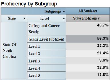 As previously reported, the graduation rate in the state, as indicated by NC DPI, is 85.8%. However, the grade level proficiency and career and college readiness of students in key subject areas of English and Math remain nearly unchanged and low.