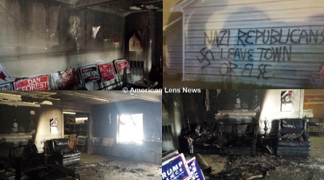 The firebombing caused extensive damage to the building. Graffiti was left on one side of the building which was written in a distinctive manner and which read, “Nazi Republicans Leave Town or Else.”