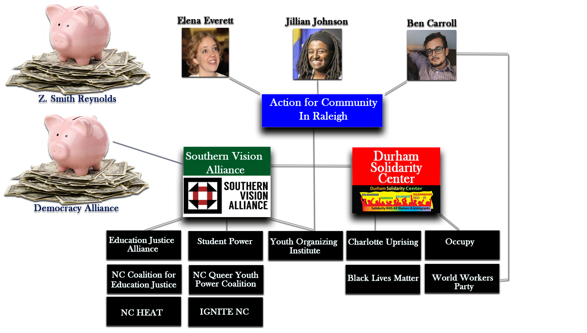 The registered agent for both Southern Vision Alliance and Durham Solidarity Center websites is Durham Councilwoman Jillian Johnson.