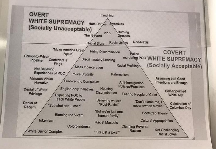 The white supremacy pyramid includes categories noted as Overt White Supremacy and Covert White Supremacy. Topics such as white savior complex, denial of white privilege and “make America great again” are included in the pyramid.