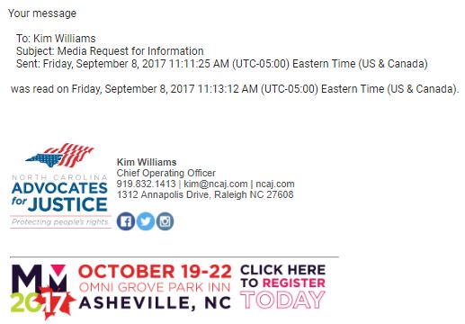 Our records indicate the email to Wall was received and first read on 09-08-17 at 11:13 a.m. by Kim Williams, COO of NC Advocates for Justice (NCAJ).