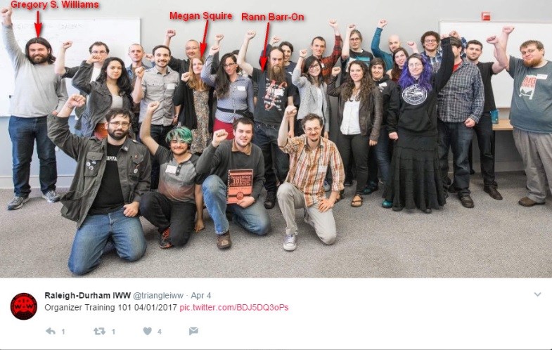 Two now well-known faces of the International Workers of the World are Duke lecturer Rann Bar-on and activist Greg Williams. They have both been arrested over the last year on multiple occasions. See the following reports: