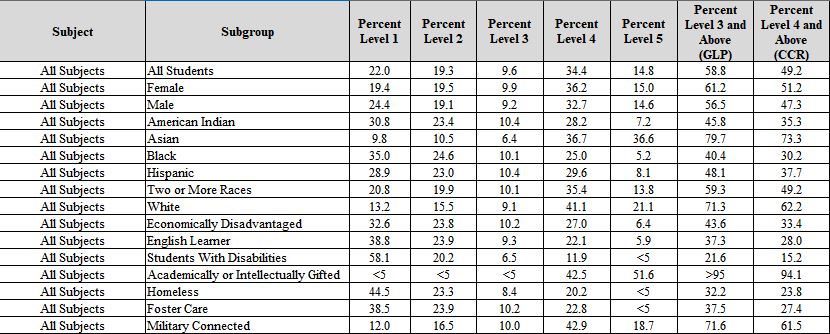 If one subtracts level 3 out of the GLP total, only 44.9% of kids are reading at grade level and around 34% are career and college ready.