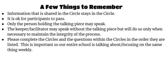 According to the ‘rules’ for Circle Time, students are given a topic to discuss and only the person holding the “talking piece” is allowed to speak and rules say that information shared within the circle is supposed “stay in the circle.”