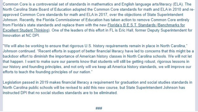 State Supt Mark Johnson announced that the NC DPI “will be re-examining the Common Core standards and U.S. history requirements…”