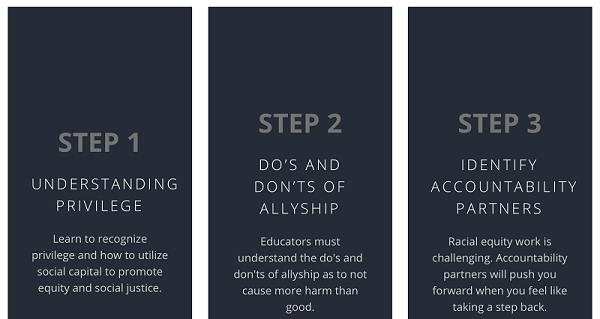 The ally section has three steps, the first of which is to make sure all white people know they are the problem, step two is for the white person to know their place, and step three is where white allies are supposed to recruit more people to undergo steps one and two.