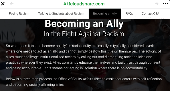 The petition then requests that WCPSS “immediately remove their Office of Equity Affairs (OEA) new web site “Racial and Equity Resources for WCPSS Educators and Staff” and provides the raw link to the website: https://tfcloudshare.com/wcpssoea/racial-equity-resources/