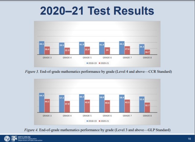 Test data from the 2020-21 school year was unambiguous in the presentation of the results to the state board of education, which included steep declines in proficiency and career and college readiness across all End of Grade (EOG) and End of Course (EOC) assessments.