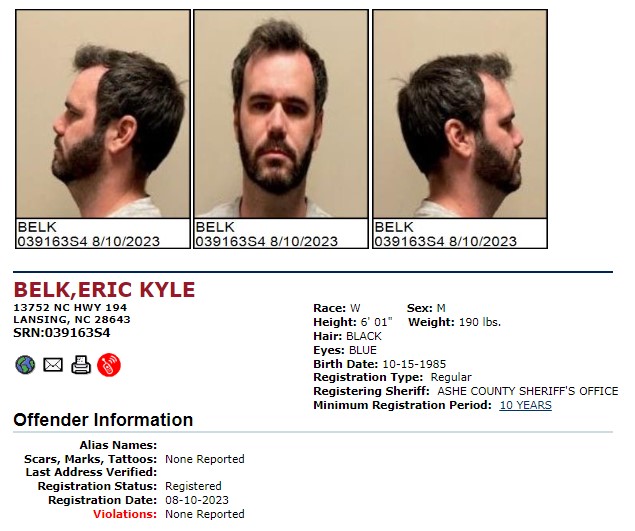 Belk was convicted on Aug. 9, 2023, on what appears to be one count of second degree sexual exploitation of a minor. He was given a suspended sentence and supervised probation for 60 months.