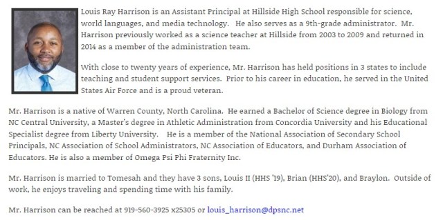 As of the publication of this article, his bio was still active on the Durham Public Schools website and says he was a science teacher at Hillside from 2003 to 2009 before joining the district’s administrative team in 2014. Harrison was also a head coach at Hillside since 2016, but also between 2004 and 2008.
