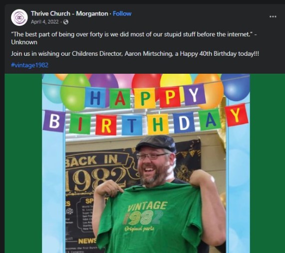 Last year, Thrive Church also made a celebration post on its Facebook page for Mirtsching’s 40th birthday with the caption, “The best part of being over forty is we did most of our stupid stuff before the internet.”