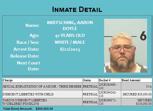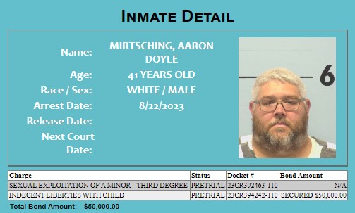 Aaron Doyle Mirtsching, age 41, was arrested on Aug. 22 on three counts of third-degree sexual exploitation of a minor. The charges stem from possessing images depicting sexual abuse of children between the ages of 8 and 10, per warrant documentation.