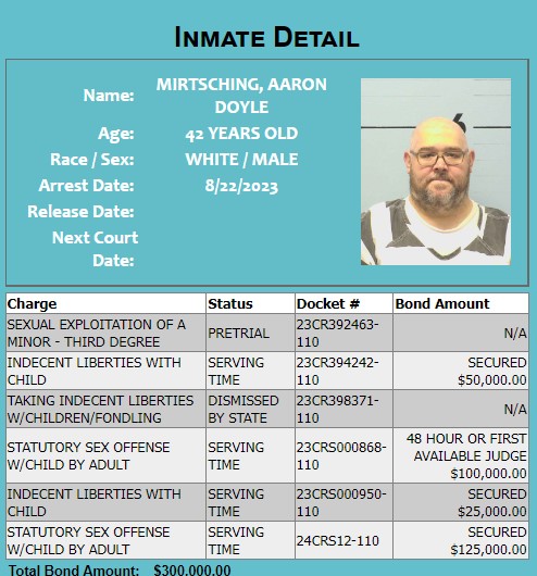 Mirtsching was re-arrested on Aug. 24 after investigators received more information related to a 16-year-old individual and he was charged with 10 counts of indecent liberties with a child.