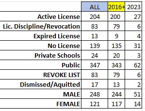 Additionally, it should be noted that the total of revoked teacher licenses in the chart above is based on a list maintained by the state and is slow to be updated.