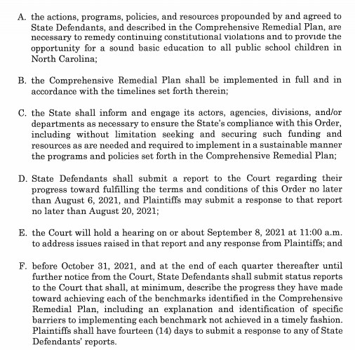 On June 15, the joint report to the Court was published: Fiscal Year 2021 Action Plan For North Carolina. Dr. Terry Stoops of the John Locke Foundation wrote an overview of what the plan entails, including around $426M in additional spending, for Carolina Journal on June 18.